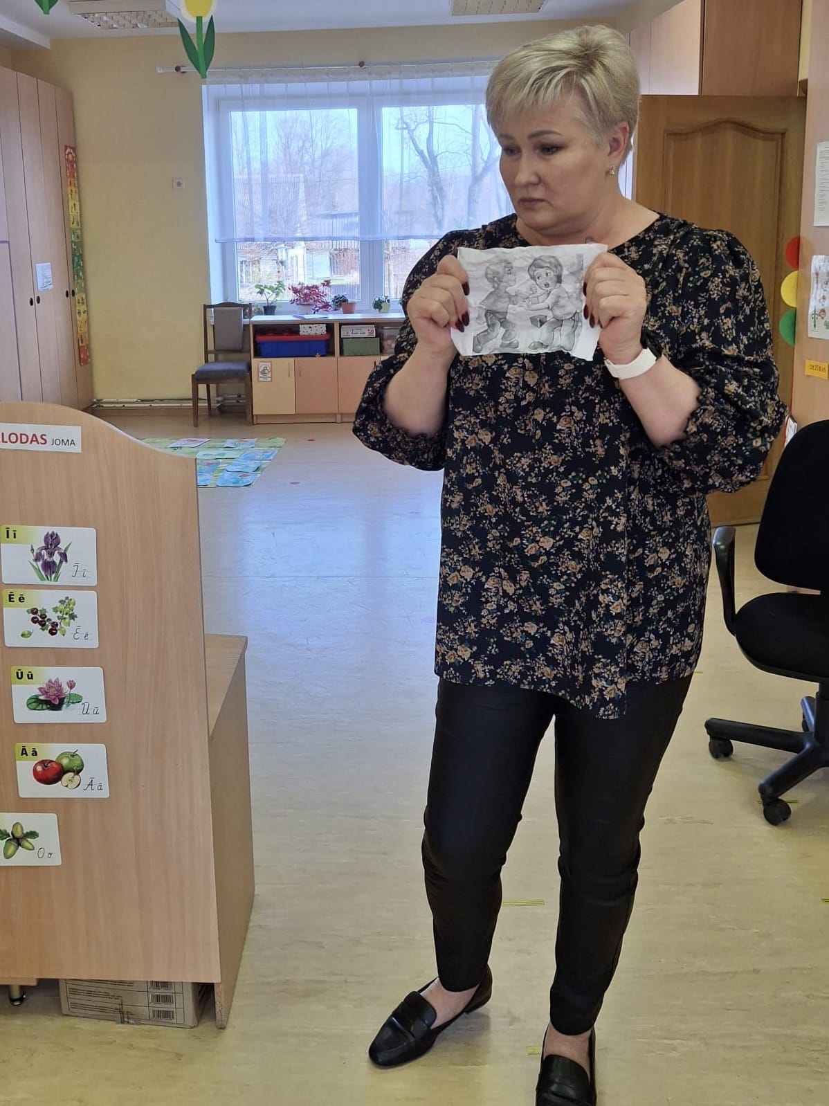 Noslēgumā bērni krāsoja darba lapas ar pareizu rīcību un aizsvītroja vardarbīgas uzvedības modeļus.