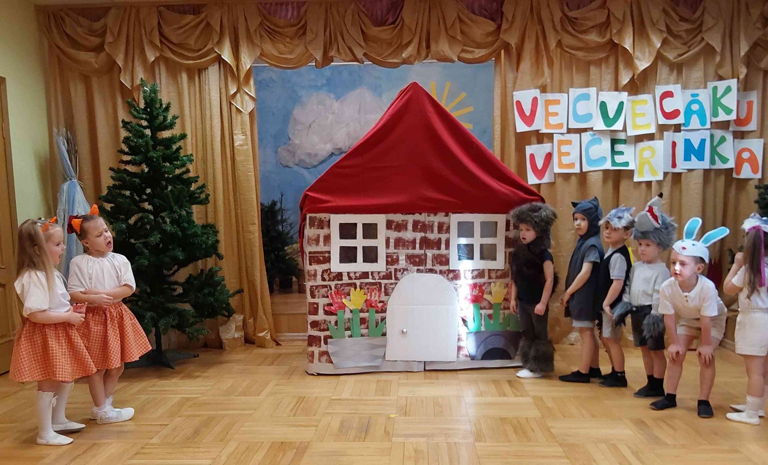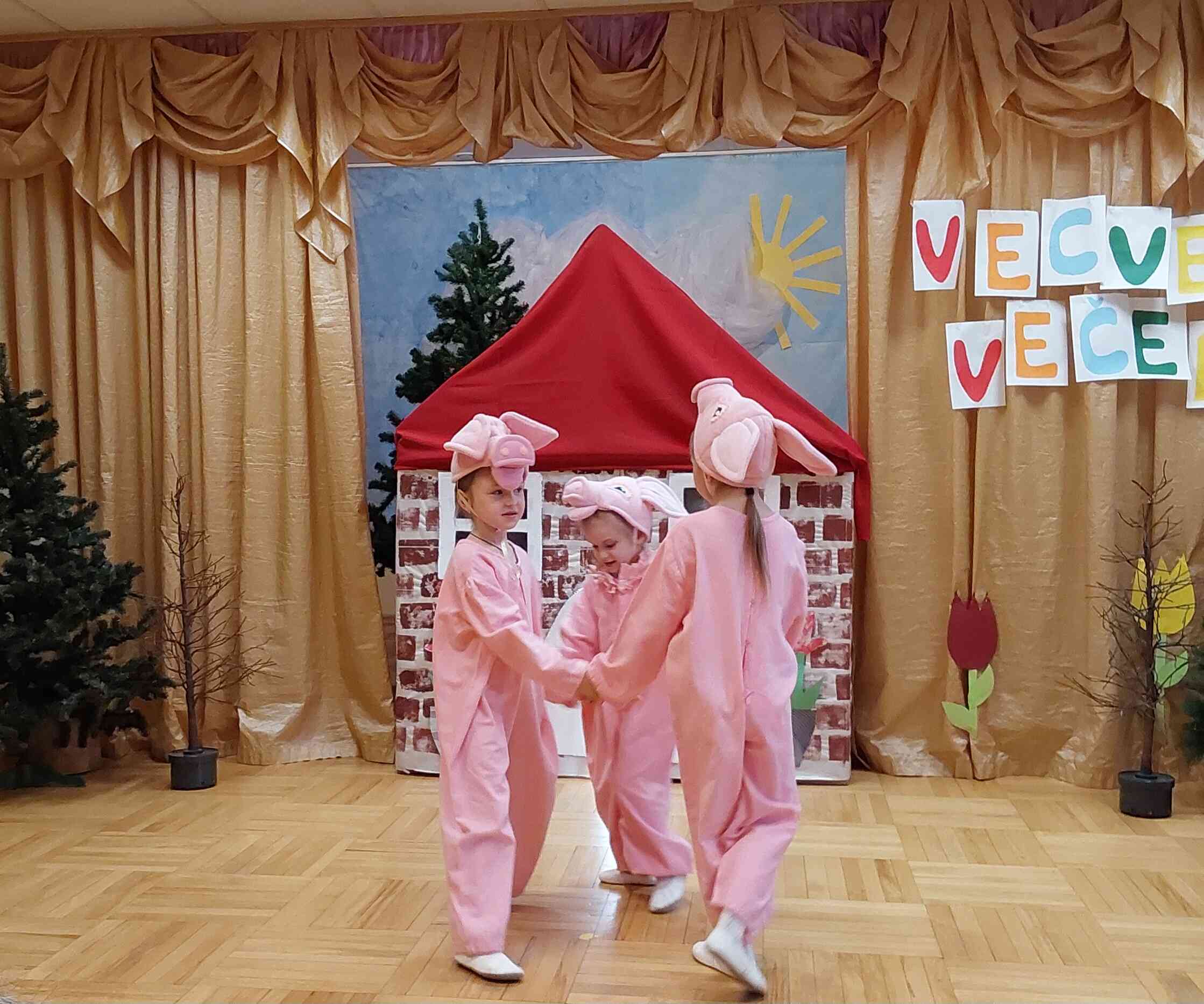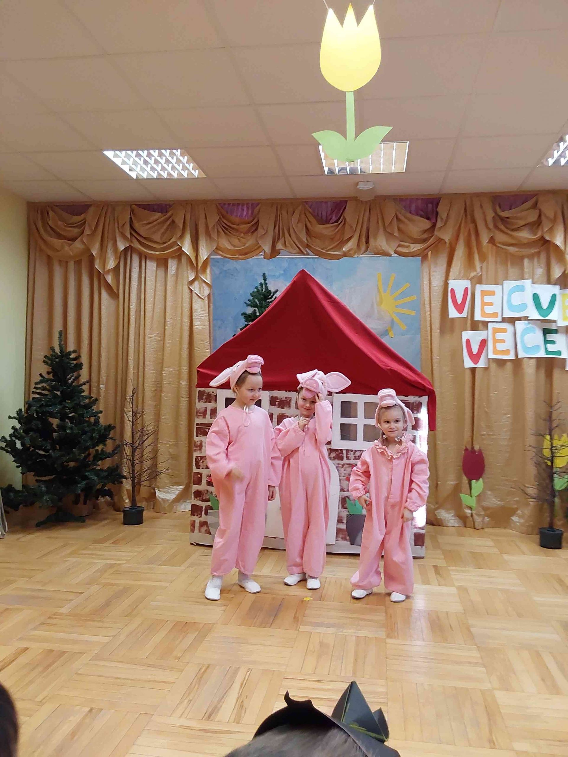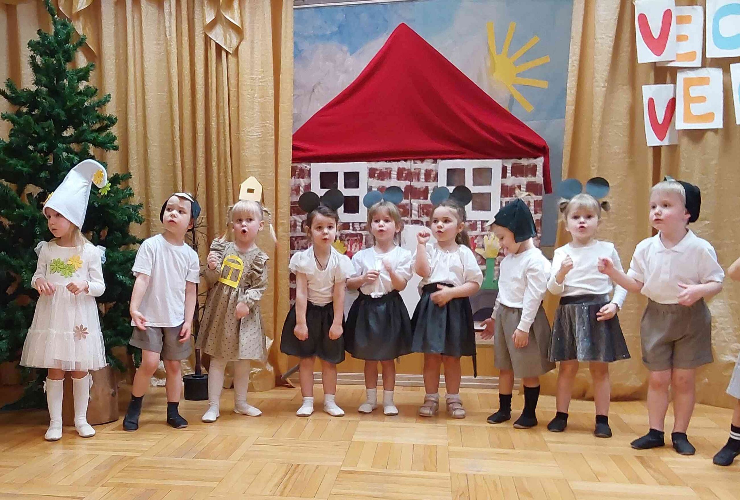 Bērni no grupas “Mārīte” bija sarūpējuši teatrālu uzvedumu pēc Brāļu Grimmas pasakas ”Trīs sivēntiņi “ motīviem.