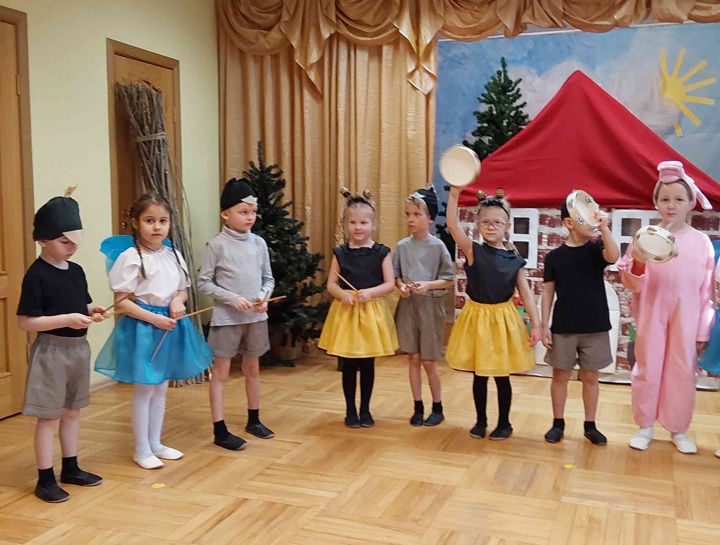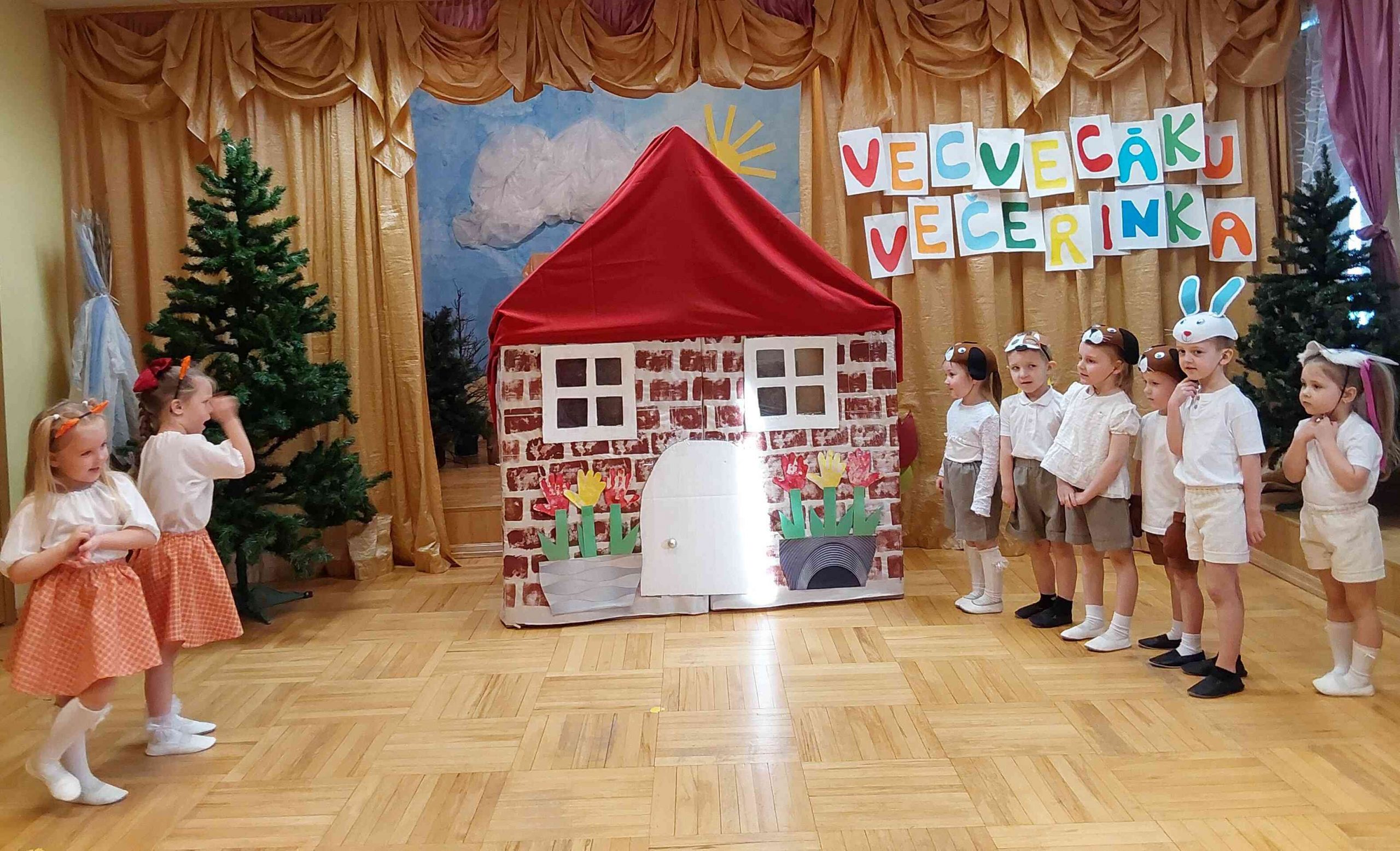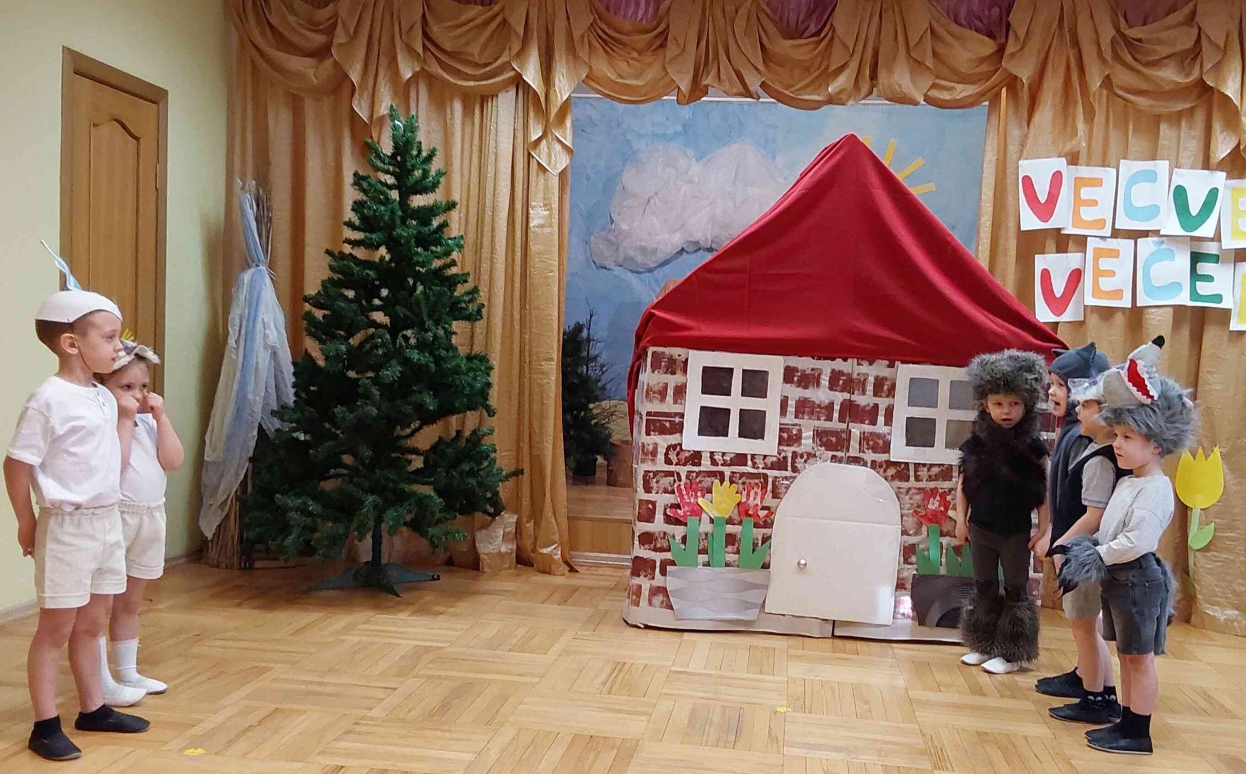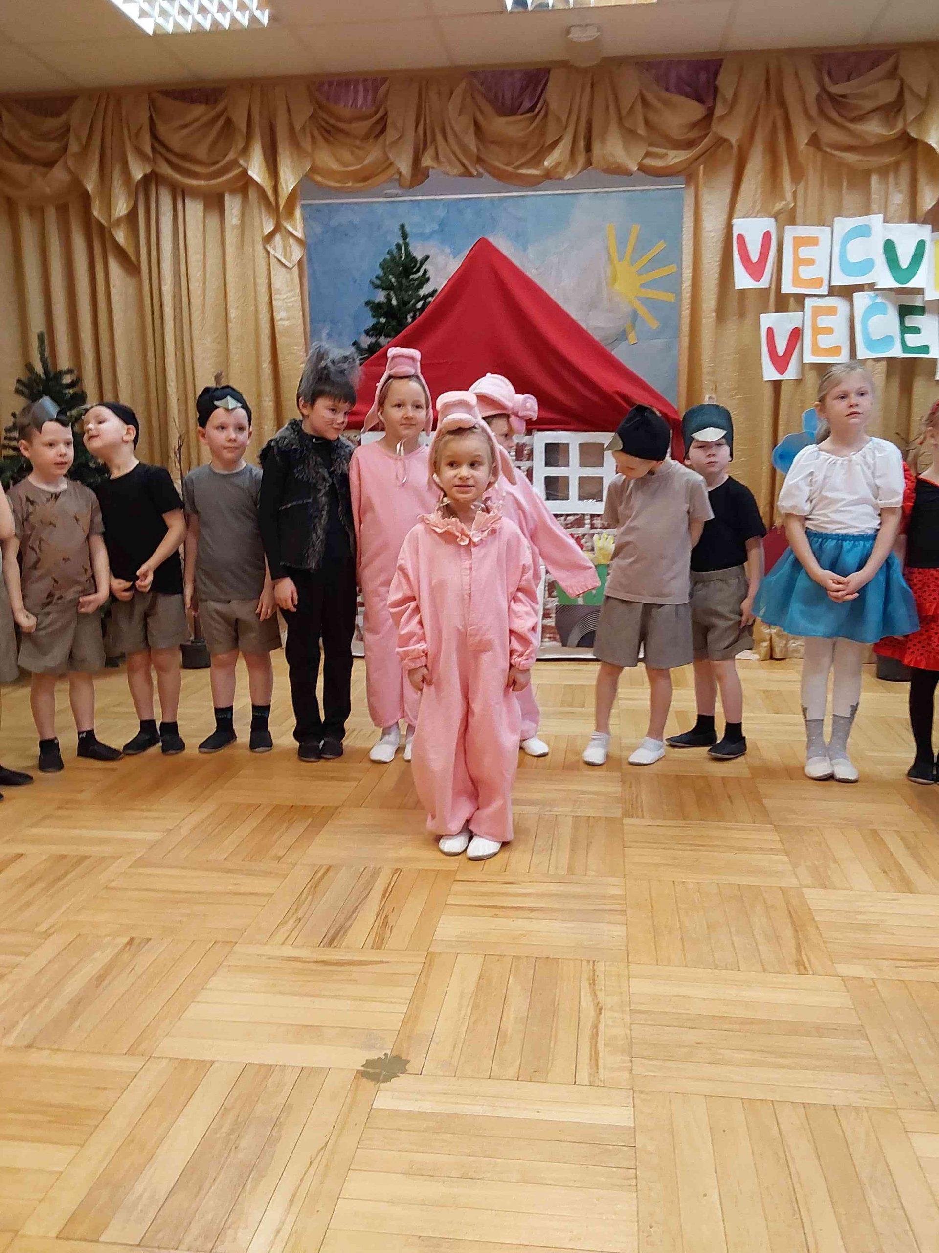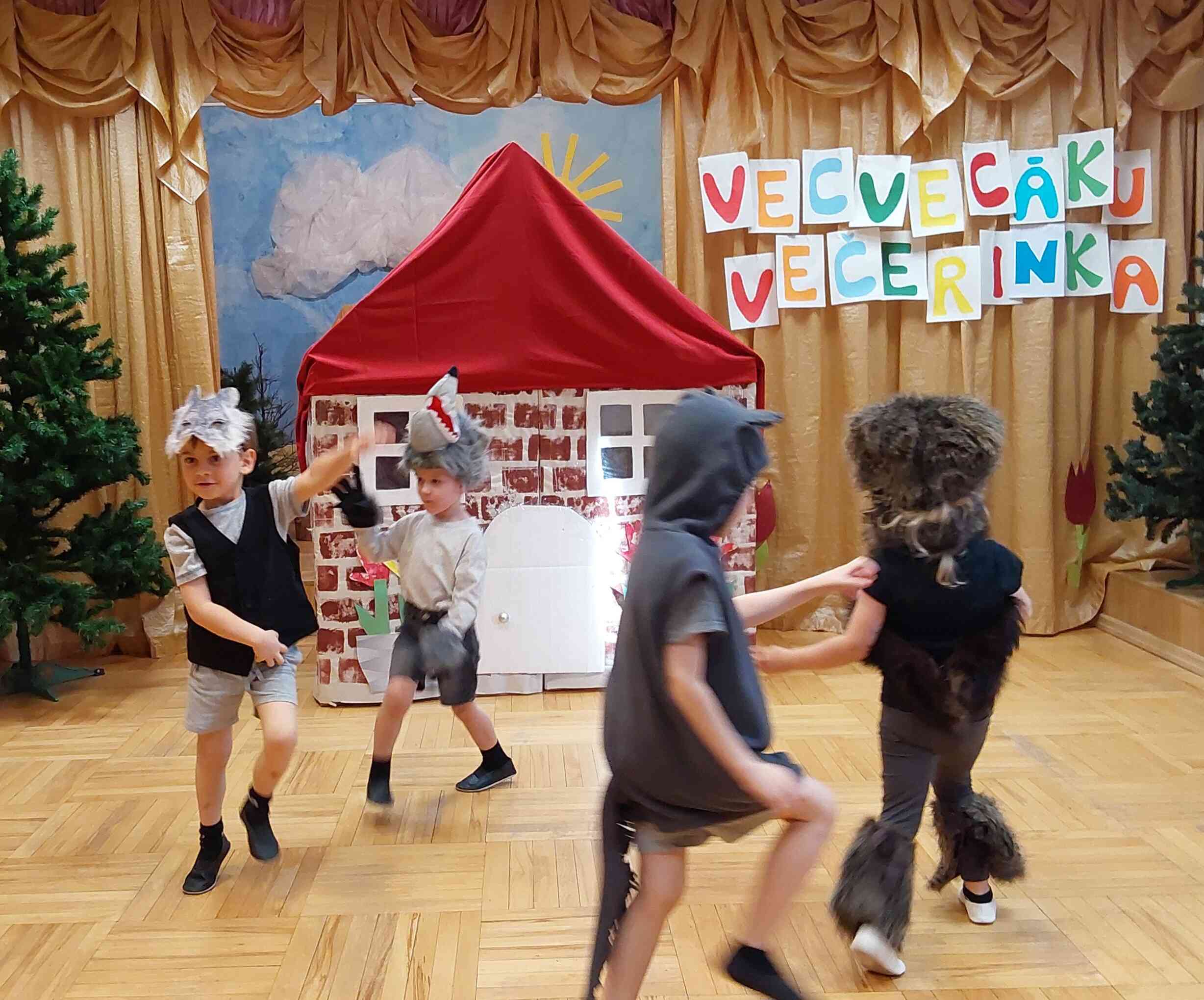 Bērni no grupas “Mārīte” bija sarūpējuši teatrālu uzvedumu pēc Brāļu Grimmas pasakas ”Trīs sivēntiņi “ motīviem.