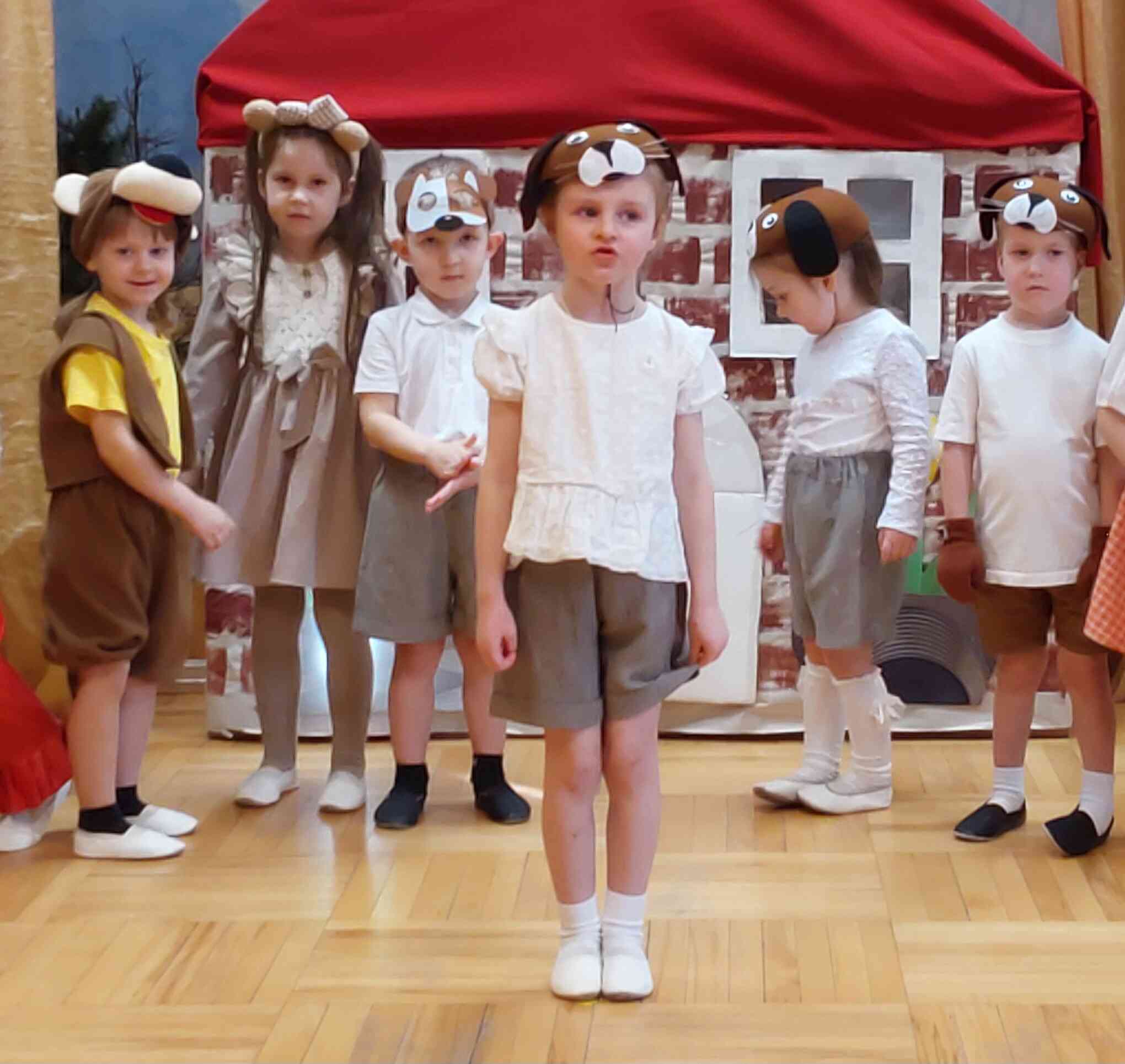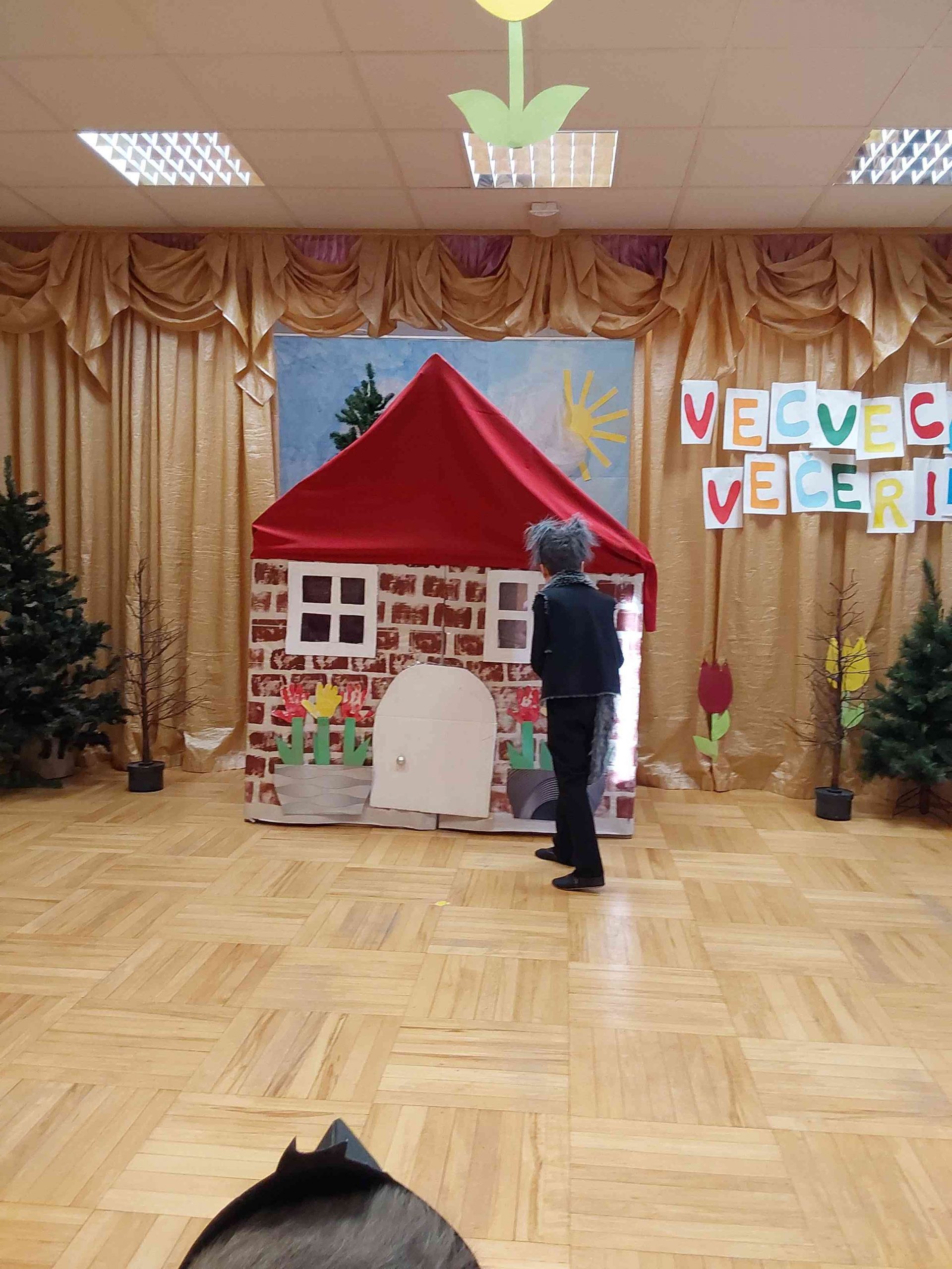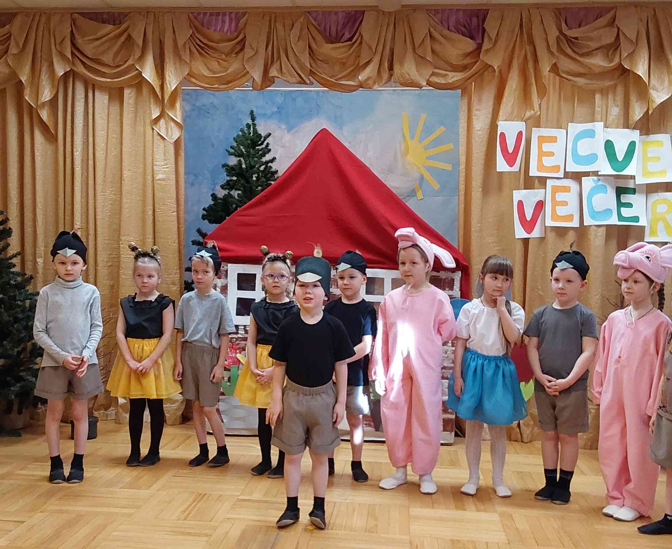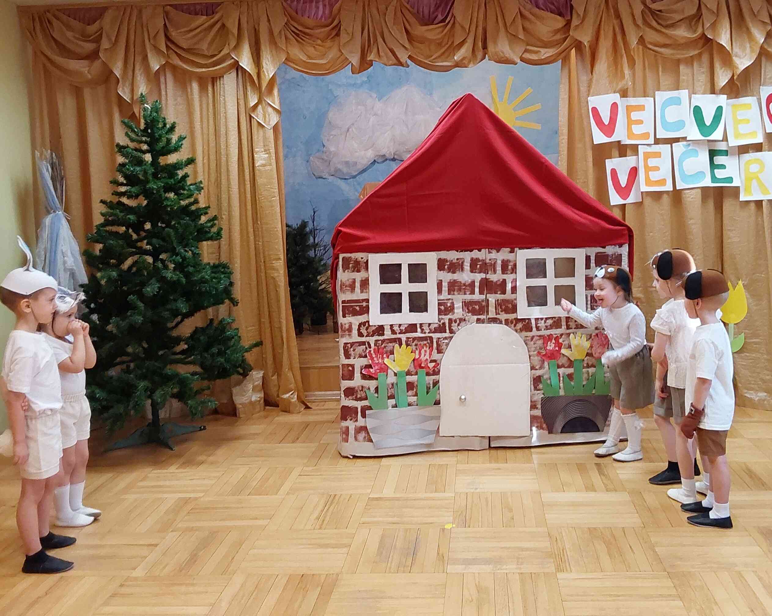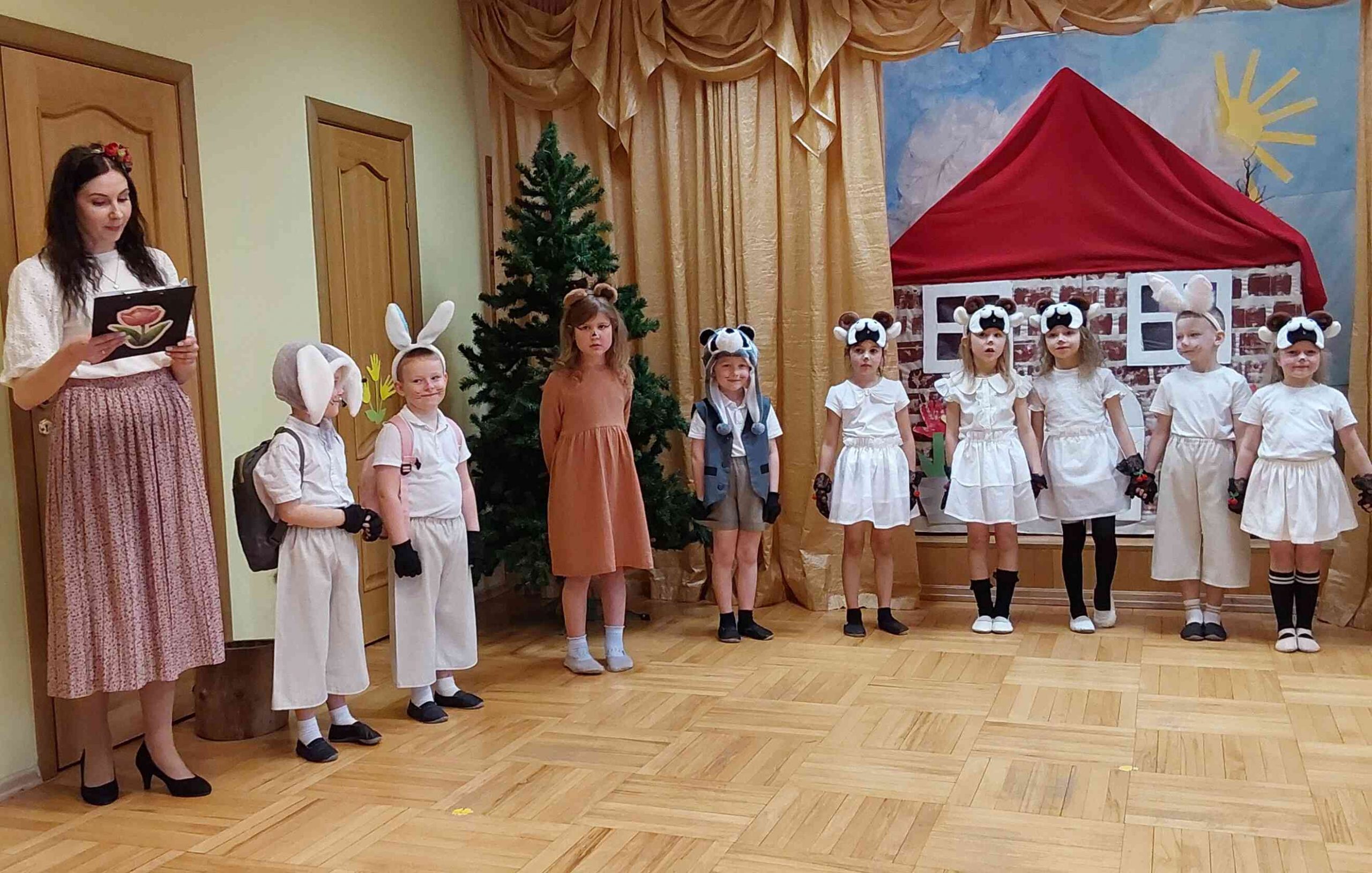 Bērni no grupas “Mārīte” bija sarūpējuši teatrālu uzvedumu pēc Brāļu Grimmas pasakas ”Trīs sivēntiņi “ motīviem.