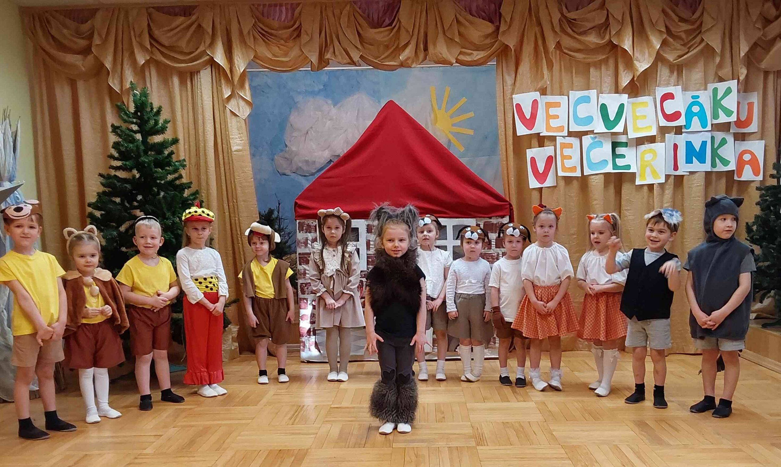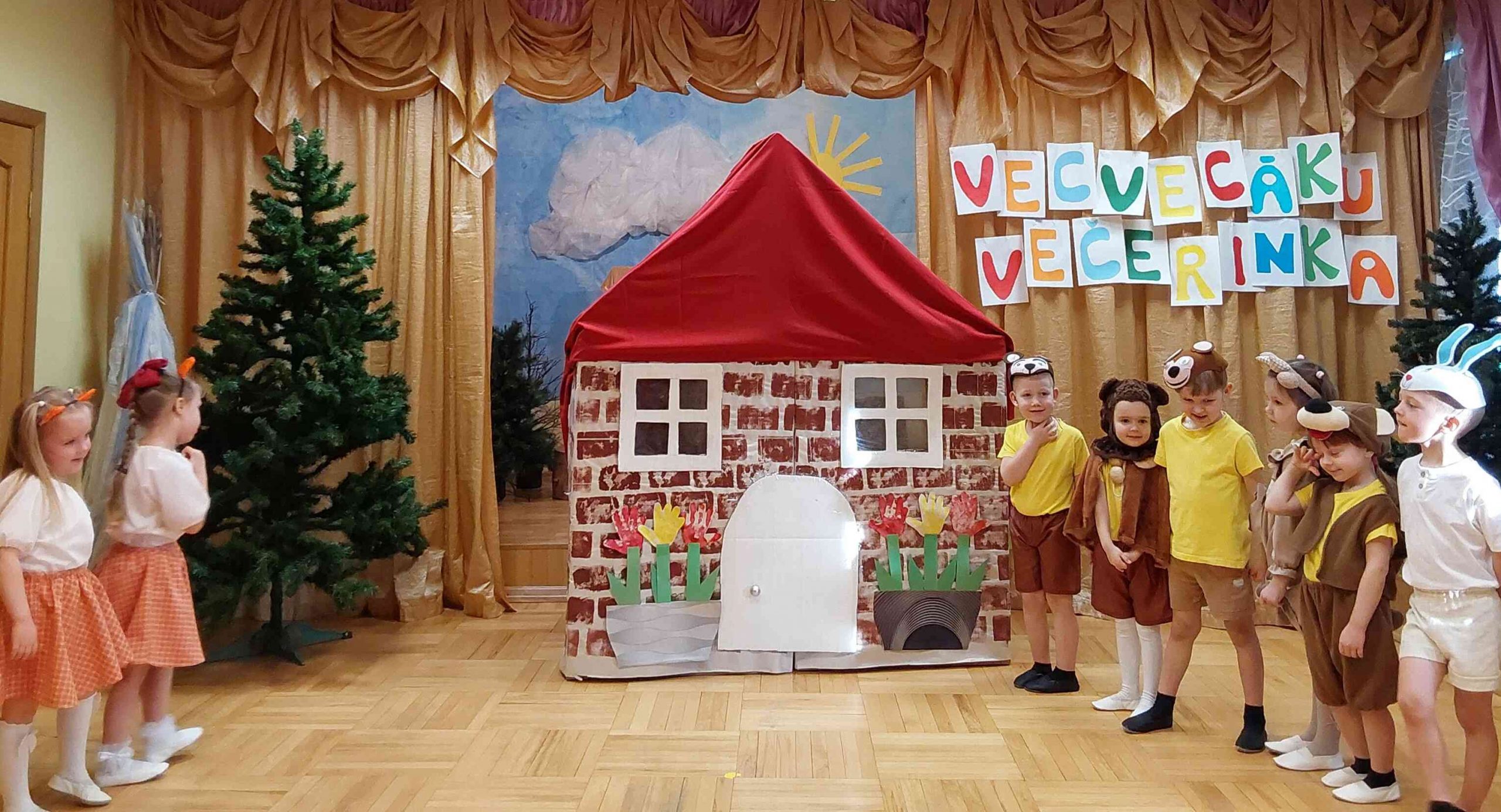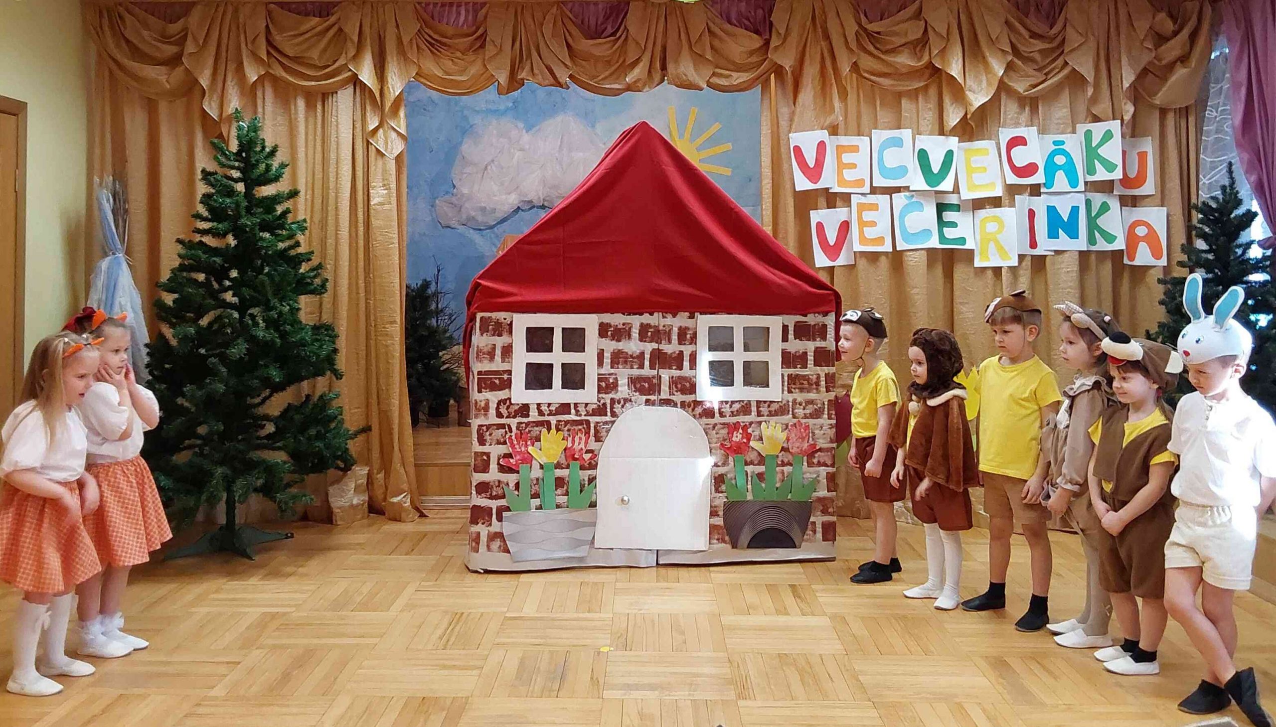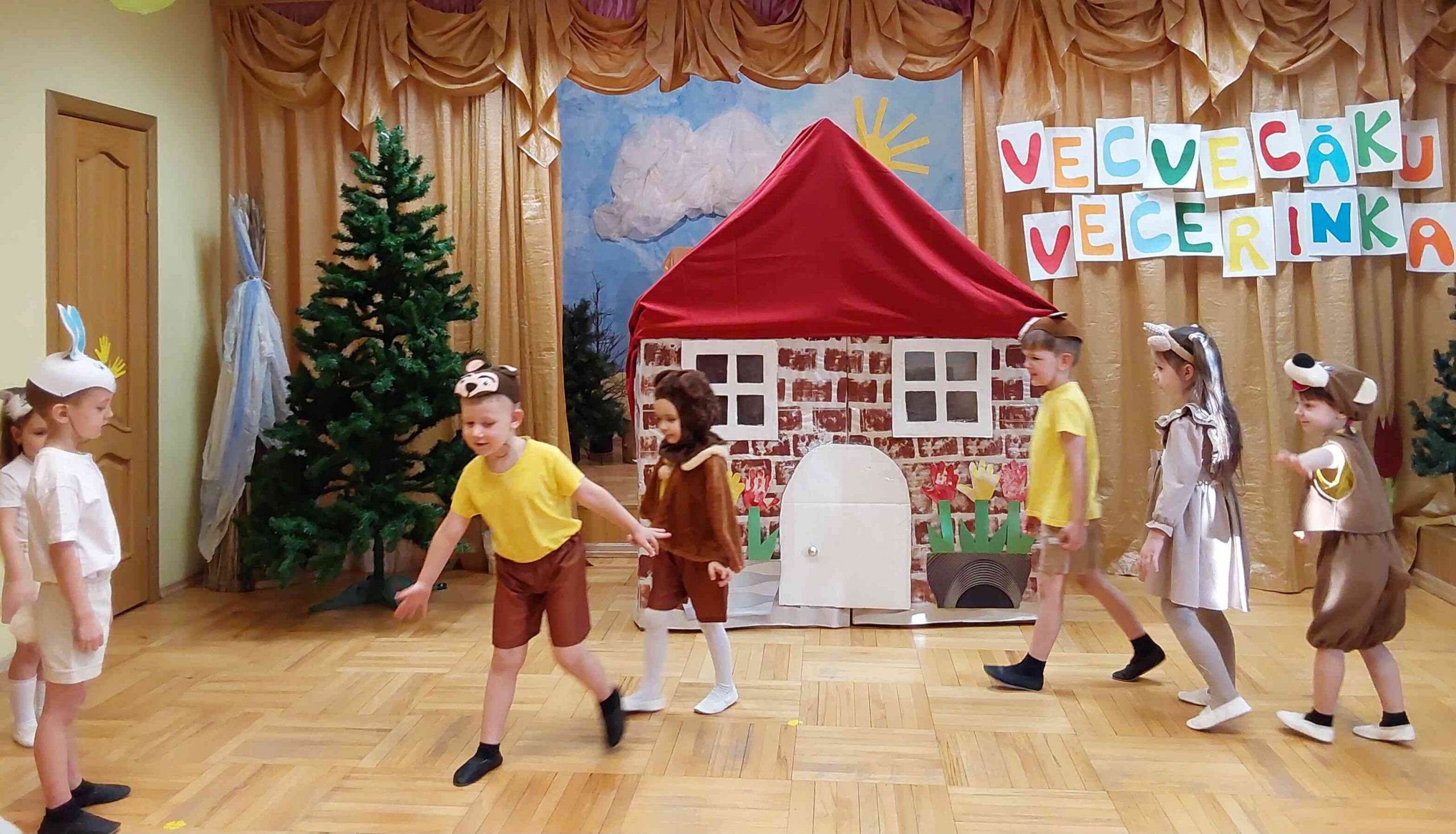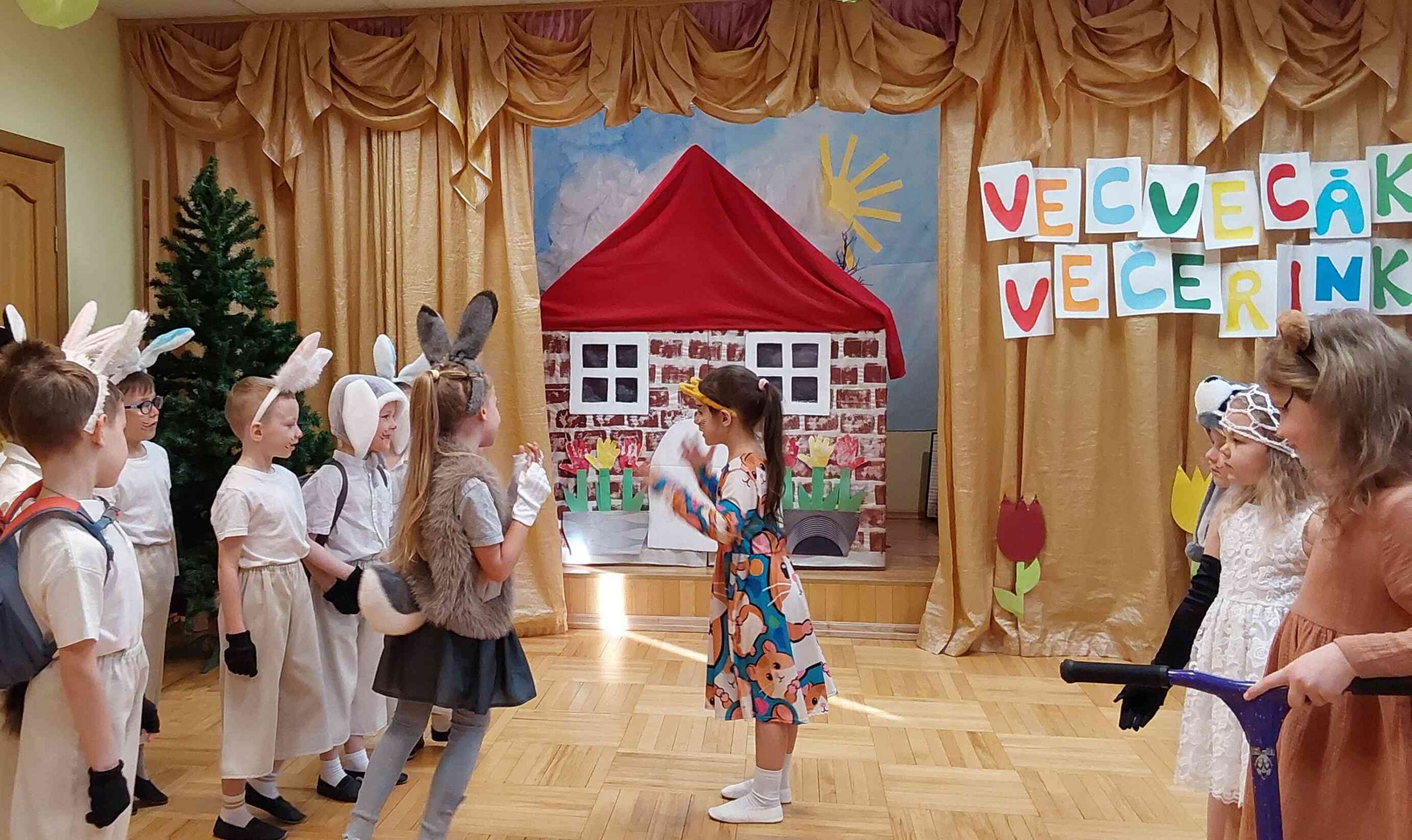 Bērni no grupas “Cālēni” sagatavoja teatrālu uzvedumu pēc pasakas “Lapsa un zaķis” motīviem.
