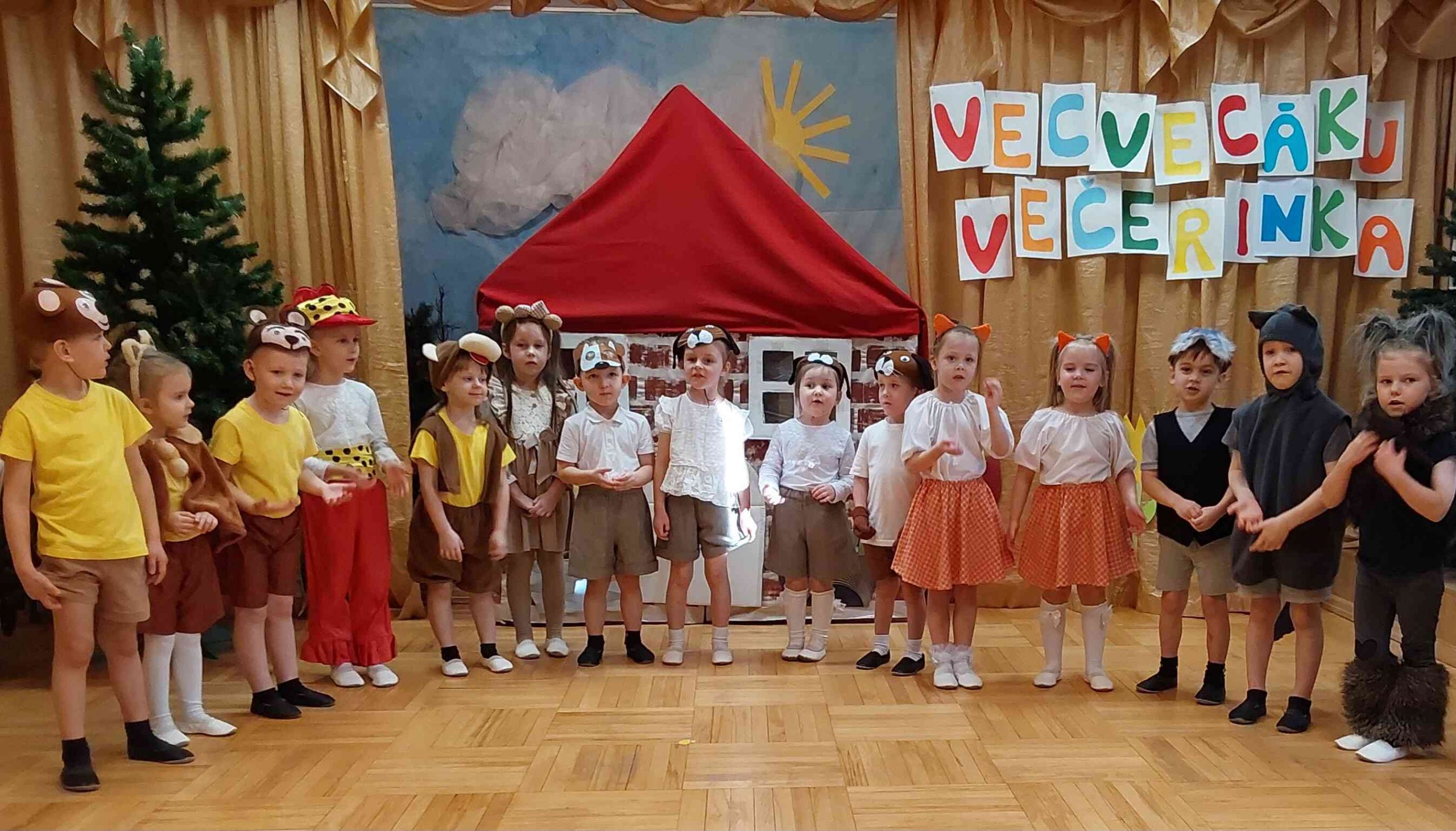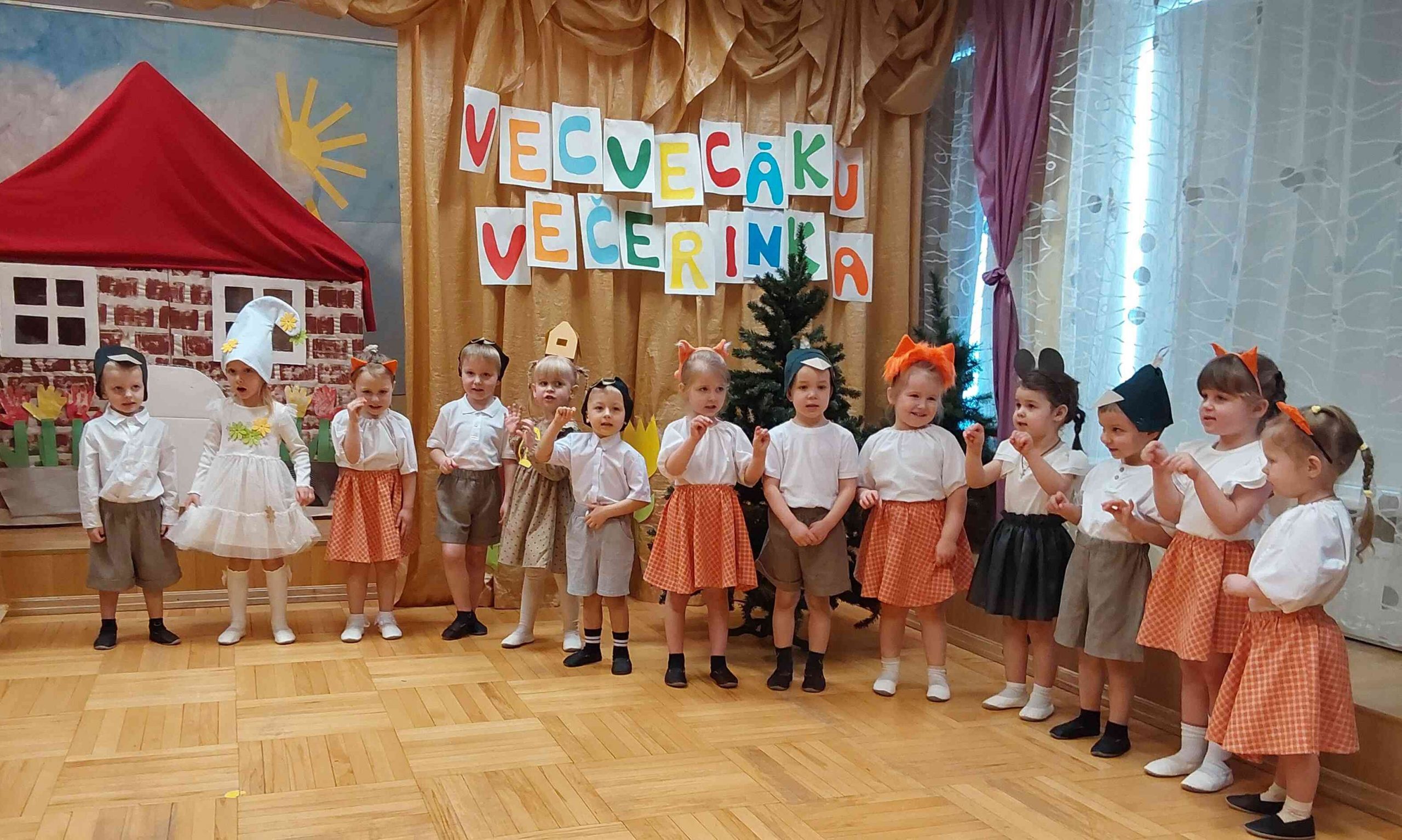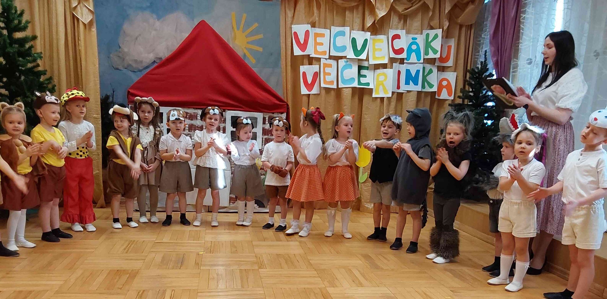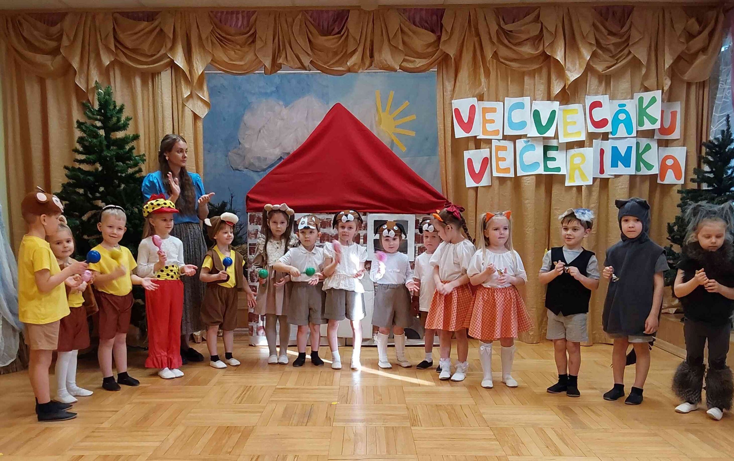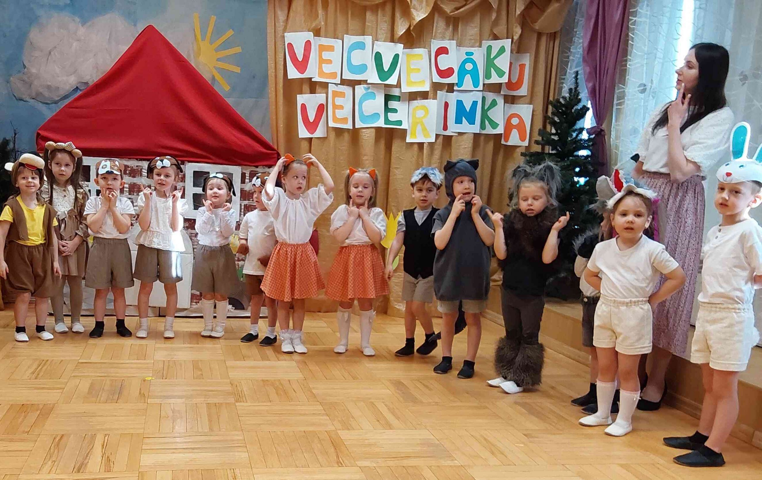 Bērni no grupas “Cālēni” sagatavoja teatrālu uzvedumu pēc pasakas “Lapsa un zaķis” motīviem.
