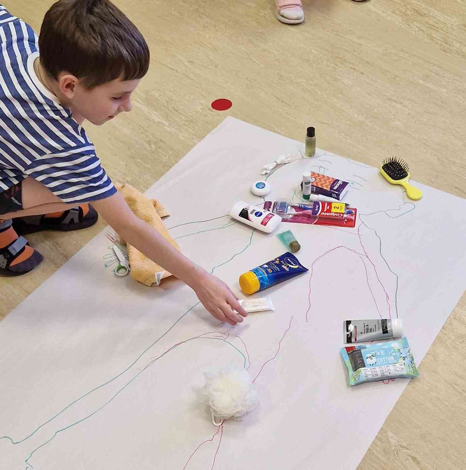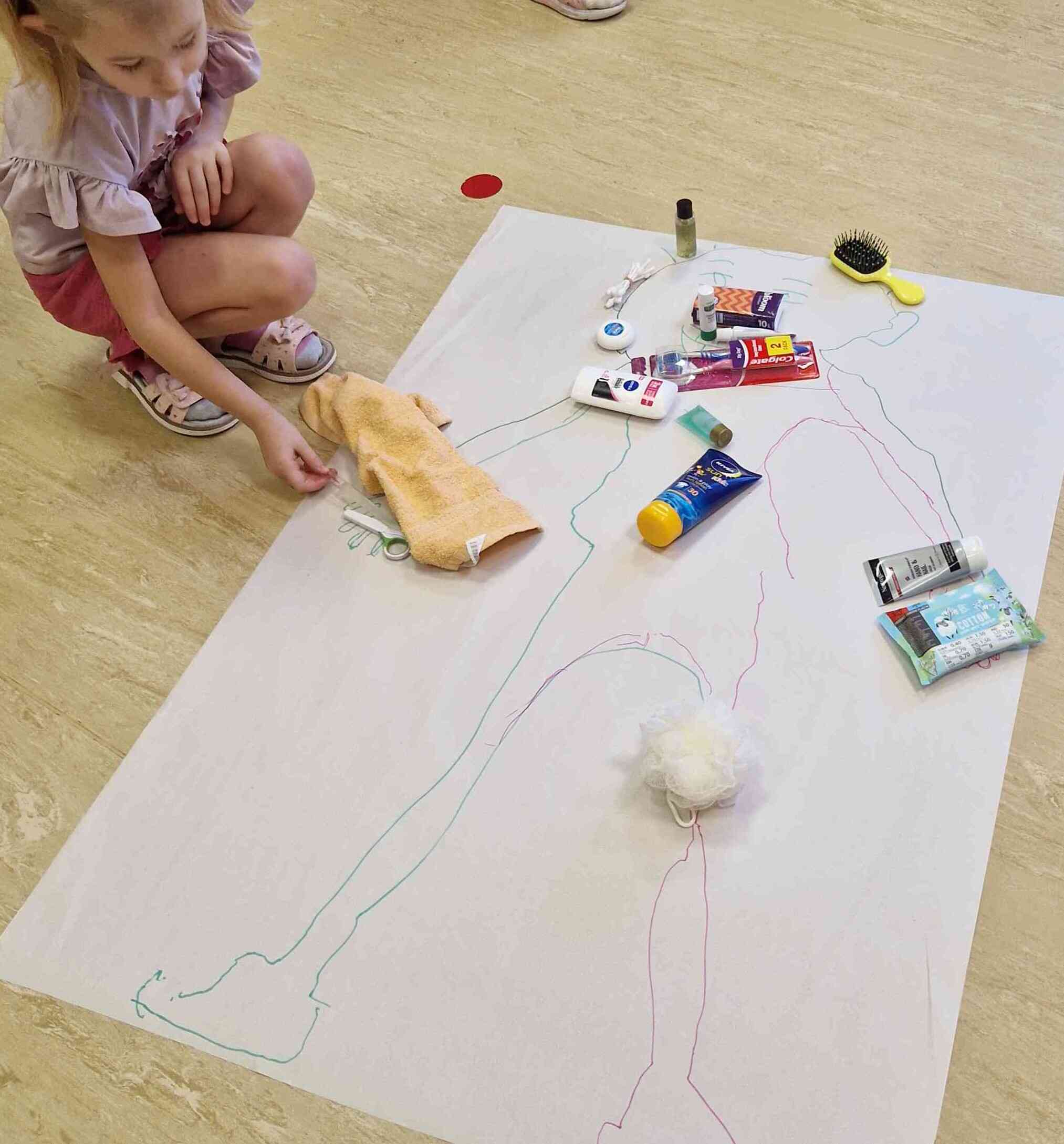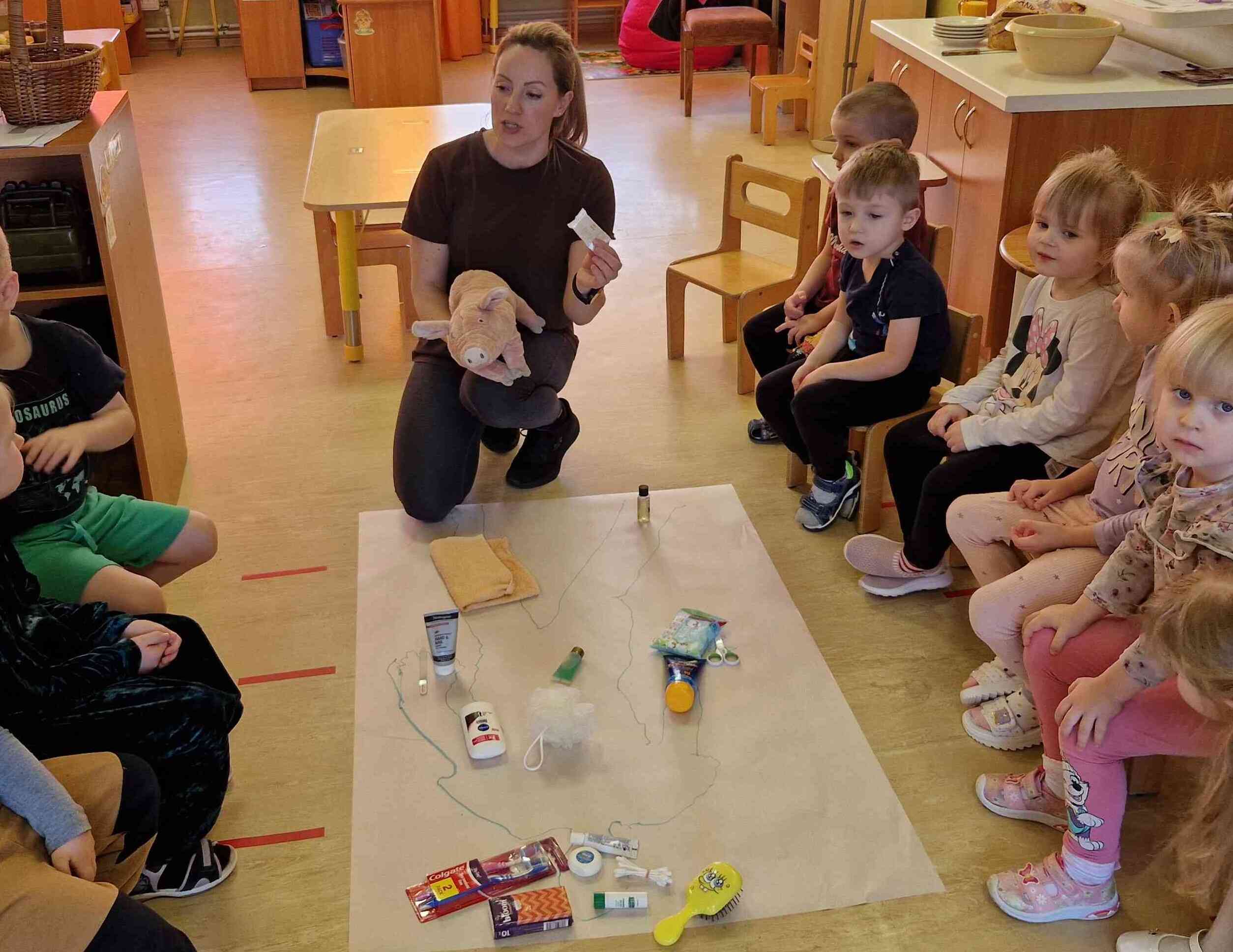 Nodarbības sākumā bērni kopīgi uz lielas lapas uzzīmēja cilvēka siluetu. Tad pie darba ķērās īpašais viesis – Ruksītis Rokijs, kurš bija sagatavojis aizraujošu uzdevumu. Katram bērnam bija iespēja no maisiņa izvilkt kādu higiēnas piederumu (zobu birsti, ķemmi, dvieli, salvetes, ziepes u.c.), pastāstīt, kas tā ir un kur to lieto, kā arī novietot to uz atbilstošās uzzīmētā cilvēka ķermeņa daļas.
