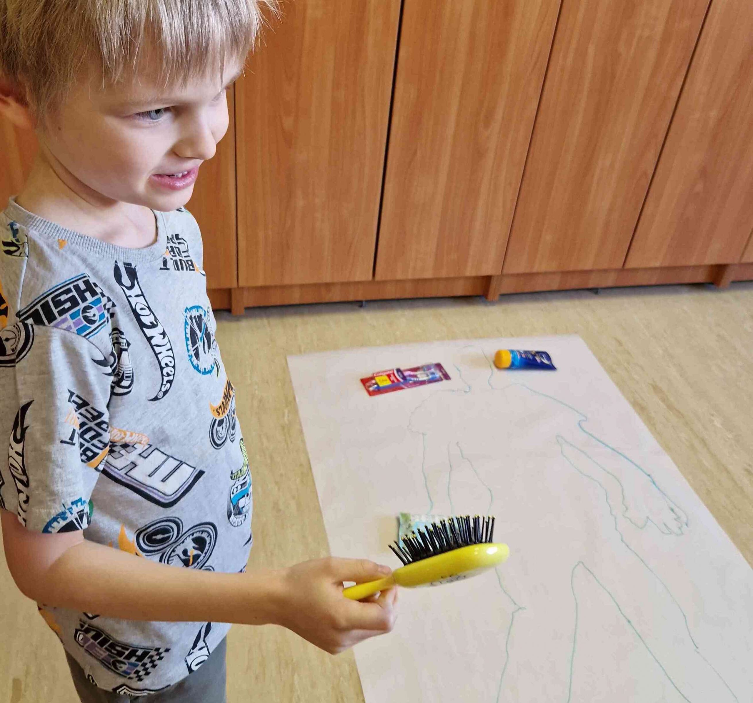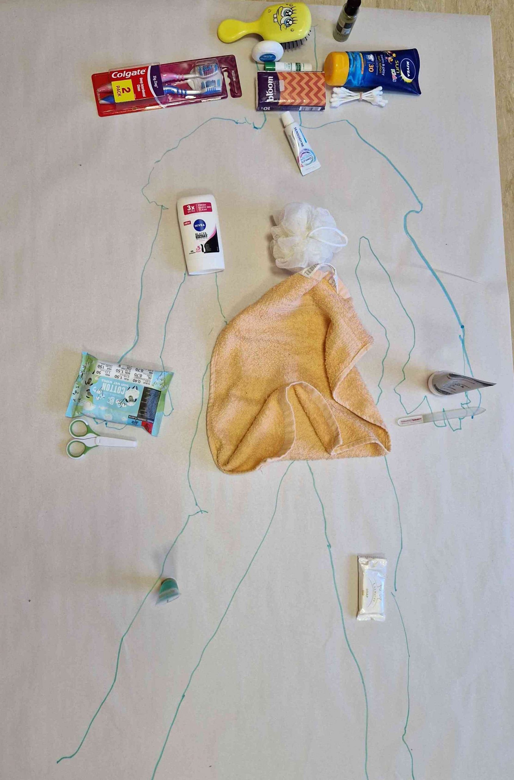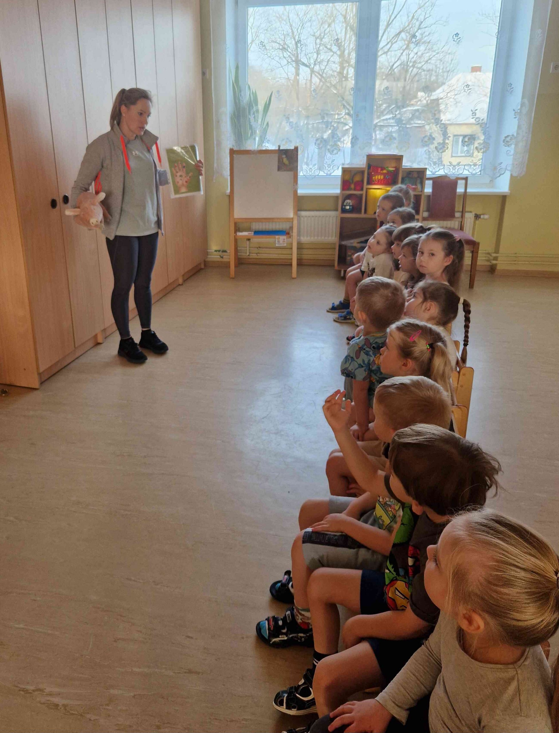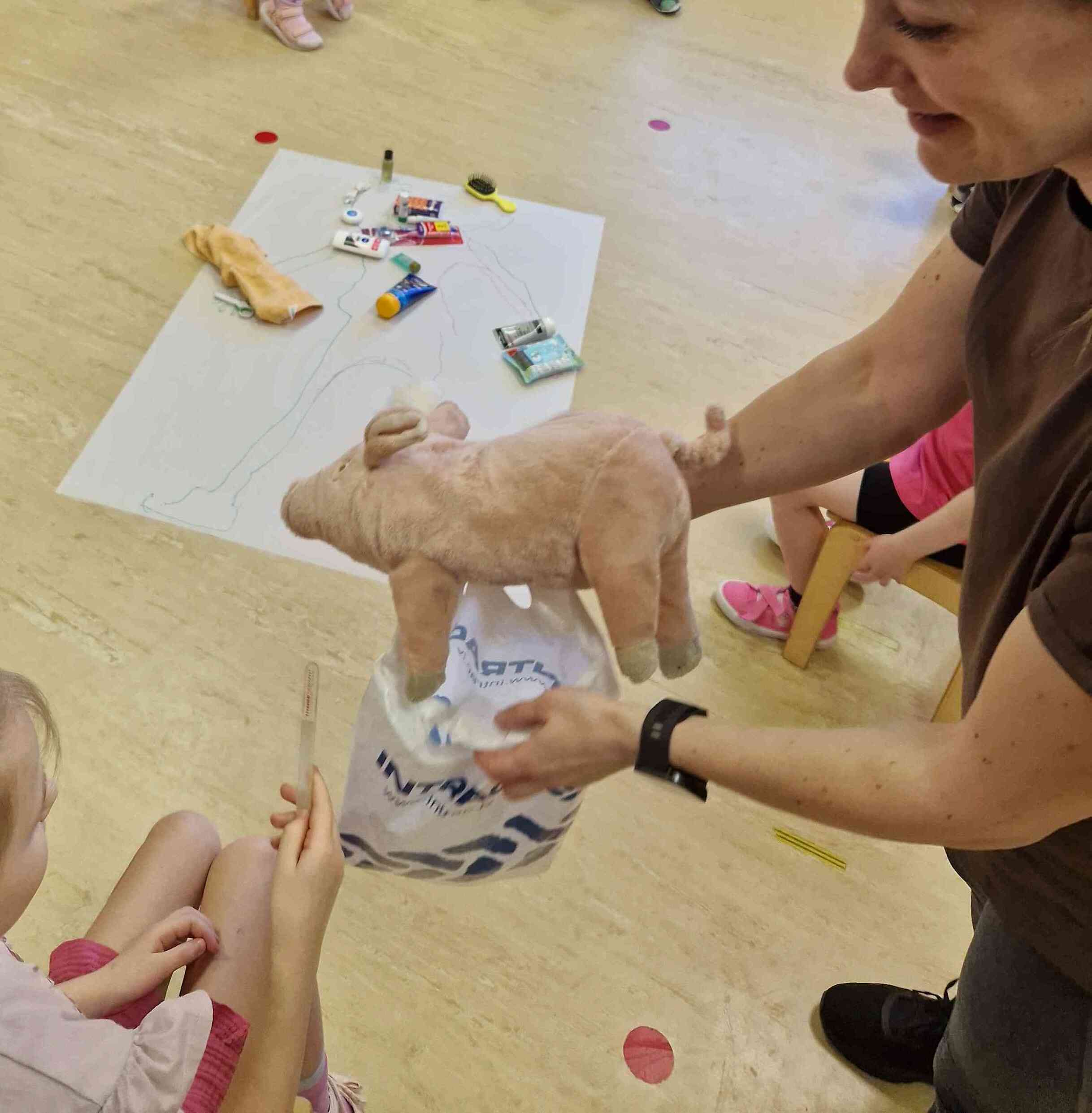 Nodarbības sākumā bērni kopīgi uz lielas lapas uzzīmēja cilvēka siluetu. Tad pie darba ķērās īpašais viesis – Ruksītis Rokijs, kurš bija sagatavojis aizraujošu uzdevumu. Katram bērnam bija iespēja no maisiņa izvilkt kādu higiēnas piederumu (zobu birsti, ķemmi, dvieli, salvetes, ziepes u.c.), pastāstīt, kas tā ir un kur to lieto, kā arī novietot to uz atbilstošās uzzīmētā cilvēka ķermeņa daļas.
