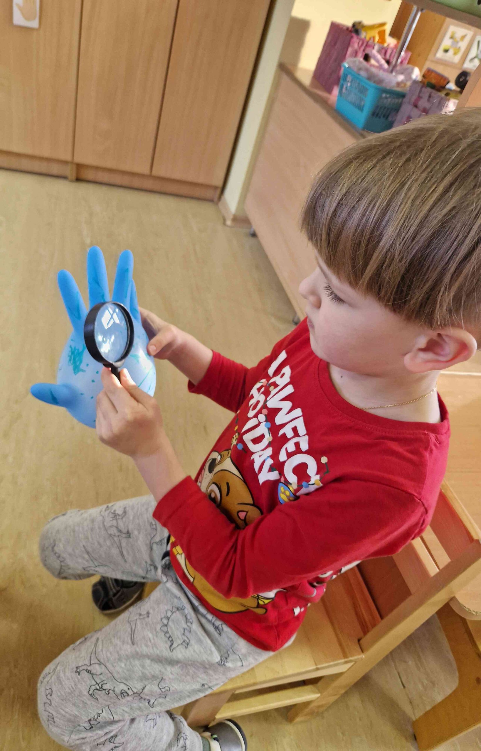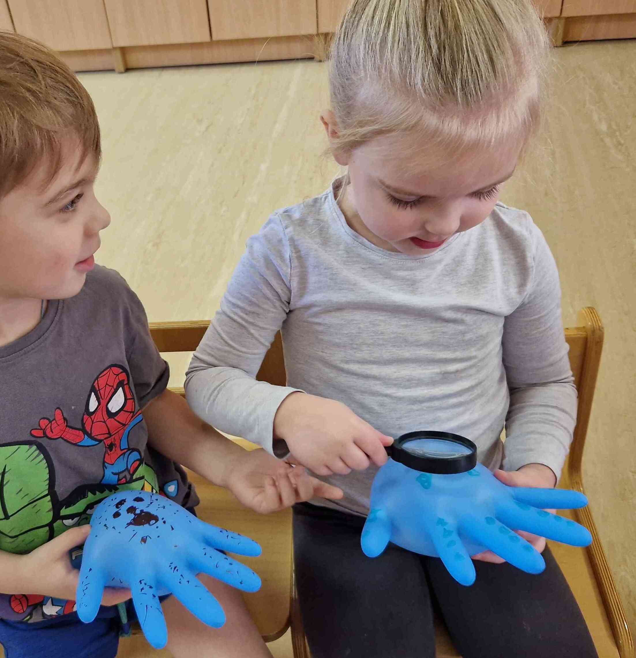 Lai tēma būtu saprotamāka un interesantāka, bērniem tika piedāvāta iespēja iztēloties, kā varētu izskatīties mikrobi un netīrība uz rokām, un tos praktiski attēlot, zīmējot uz īpašas “gumijas plaukstas”. Pēc tam bērni iejutās pētnieku lomā un ar lupas palīdzību vēroja “mikrobus” palielinājumā.