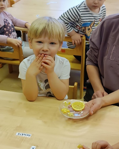 13.01.26. tika organizēta Sociālās un pilsoniskās mācību jomas nodarbība, kuras laikā trīsgadīgie bērni uzzināja par vitamīnu nozīmi cilvēka organismā un kur tie ir. Visi kopā pagaršoja citronu, un kopā pagatavoja veselīgu dzērienu, kura sastāvā bija ūdens, citrons un medus.