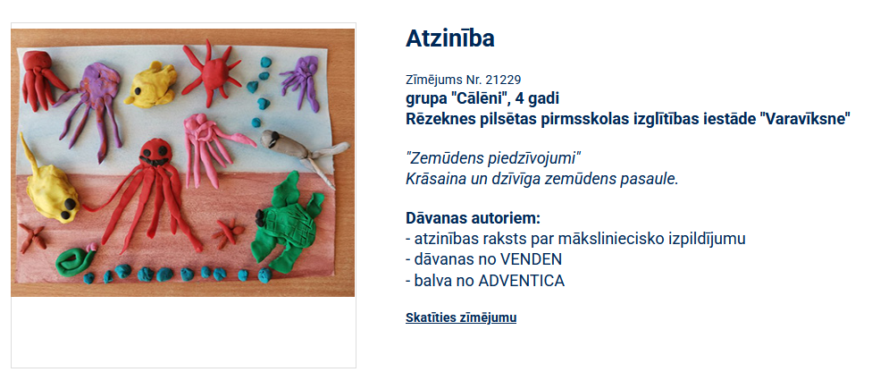 Bet atzinības rakstu par māksliniecisko izpildi no radošās žūrijas saņēma mūsu iestādes grupas “Cālēni” kopdarbs “Zemūdens piedzīvojumi”. Krāsaina un dzīvīga zemūdens pasaule. Dāvanas šī darba autoriem:
